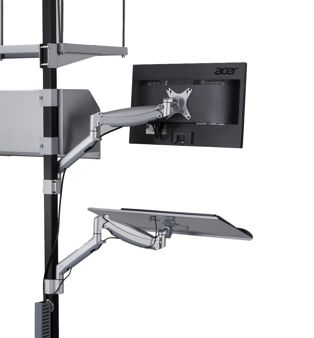 Adjust-On-Demand Arms — This option provides the most flexibility for shelf storage. The arm can be easily adjusted on-demand, moving vertically to accommodate for user height and task. The monitor can be pulled and extended and later retracted to fit into a small space profile. Discover your best-height for your specific task and needs.